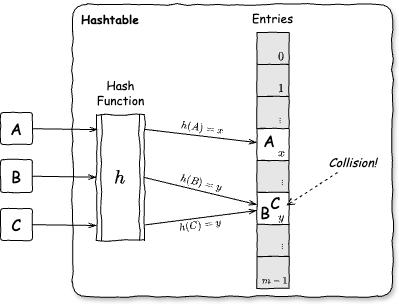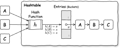 Fig 1. ハッシュテーブルの基本的な構造。ハッシュの衝突が発生したときの設計にバリエーションがある。