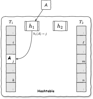 \(T_1[h_1(A)]\) が空いていれば \(T_1[h_1(A)]\) のエントリに格納する。