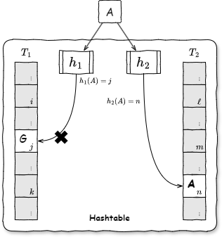 \(T_1[h_1(A)]\) に別の要素が格納されており、かつ、\(T_2[h_2(A)]\) が空いていれば \(T_2[h_2(A)]\) のエントリに格納する。
