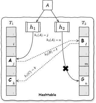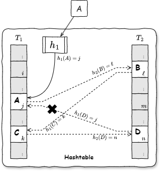 • 挿入: 要素 \(A\) を挿入するとき、\(T_1[h_1(A)]\) または \(T_2[h_2(A)]\) の空いているエントリがあればそこに格納する。両方のエントリともすでに別の要素が格納されている場合、\(T_1[h_1(A)]\) のエントリに格納する。\(T_1[h_1(A)]\) に元々あった要素 \(B\) は \(T_2[h_2(B)]\) に移動する。\(T_2[h_2(B)]\) に元々あった要素 \(C\) は\(T_1[h_1(C)]\) に移動する。これを要素の移動先が空のエントリになるまで再帰的に繰り返す。