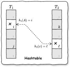 • 検索: 要素 \(x\) の検索は、最大でも 2 つのエントリ \(T_1[h_1(x)]\), \(T_2[h_2(x)]\) を検査すれば良い。したがって検索の最悪計算量は \(O(1)\) である。