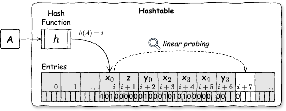 • 検索: 要素の正規スロットのホップ情報を参照すると、そのエントリからの相対位置で衝突している要素の格納されている位置が分かる。それらを逐次参照して検索対象の要素と比較する。