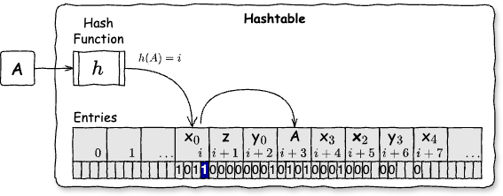 • 挿入: 探索中に空きエントリを検出した場合、単純にその空きエントリに要素を格納する。同じ要素を見つけた場合は既に同じ要素が登録されていることを意味するため、その要素を置き換える。探索開始位置に戻った場合はハッシュテーブルがいっぱいになっていることを意味しているため、エントリサイズを拡張するリハッシュを行うか挿入を拒否する必要がある。