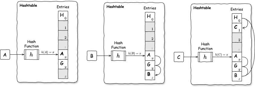 Fig 3. 線形プローブ法で衝突している要素 A, B, C を挿入する例。衝突した要素は次の空きエントリを線形探索して格納される。