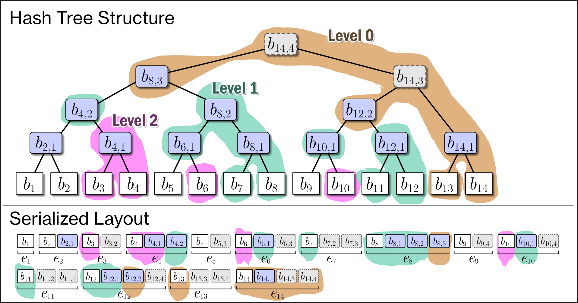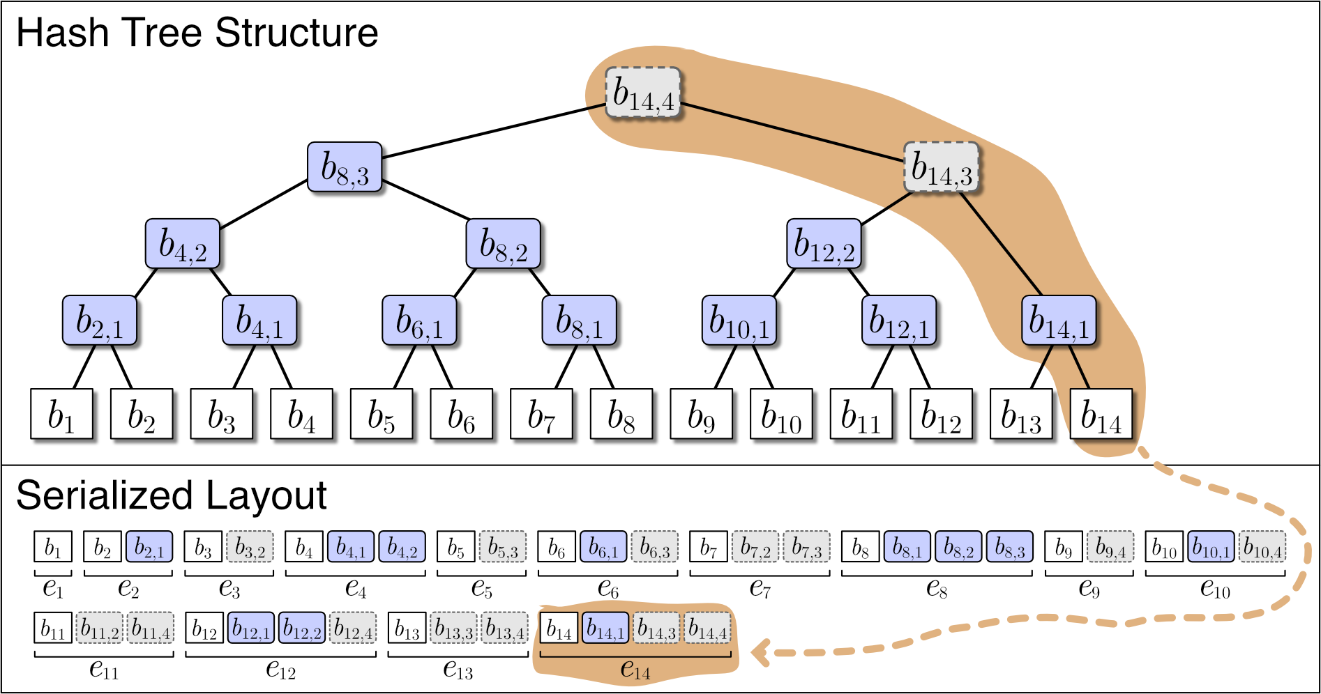 この構造の本質はデータの追加が可能なハッシュツリー (Merkle ツリー) であり、一般的なハッシュツリーと同様に小さなデータ片を用いてデータの破損や改ざんを検証することができます。