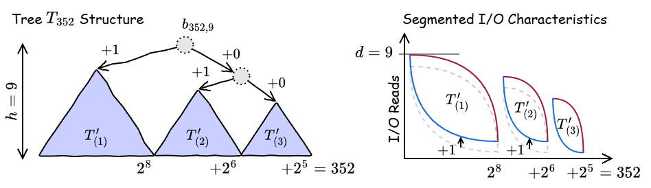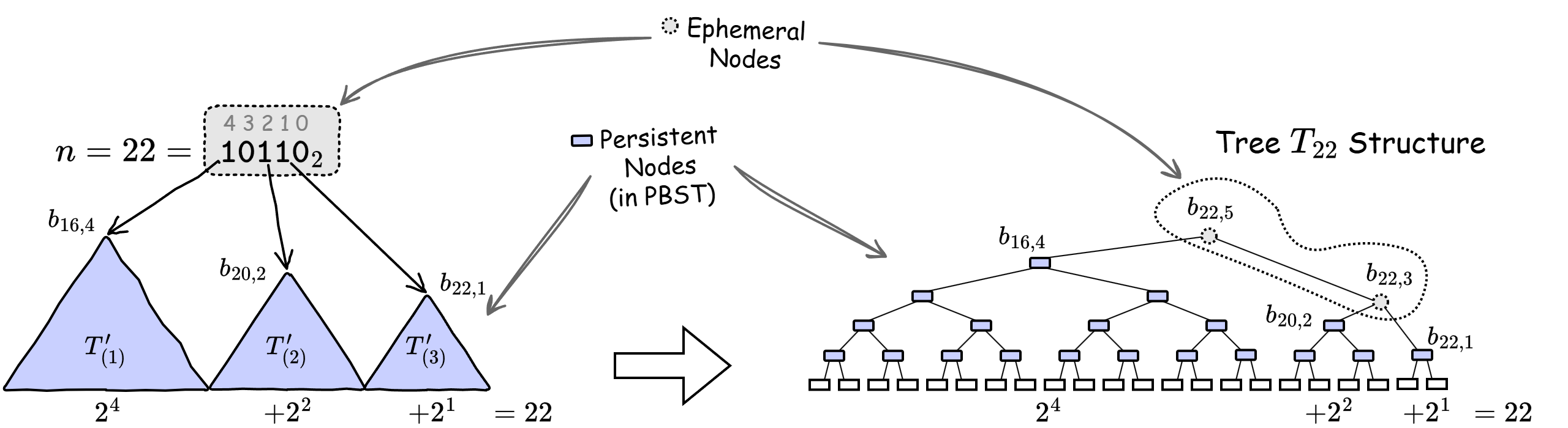 一方で、我々の Slate は、部分的永続性の特徴を提供する木構造上の追記にのみ注目している。また、バージョンスタンプや複数のポインタを注意深く管理する必要がある一般的なノードコピー方式とは異なり、Slate は各エントリ \(e_i\) が更新操作 \(i\) の間に作成されたすべてのノードを含む階層構造によってシンプルに永続性を実現する。この設計上の選択により、我々の Slate からは複雑なポインタ管理の必要性が排除されている。さらに、Slate の追記のみという特性は、分散トラザクションログやブロックチェーンのような不変性と効率的な検証が重要となる最近のアプリケーションによく適合している。Driscoll らの手法のように明示的なバージョンポインタを保持するのではなく、Slate はその層様構造によってバージョン情報を暗黙的にエンコードし、時間的局所性を空間的局所性として自然に保持する。