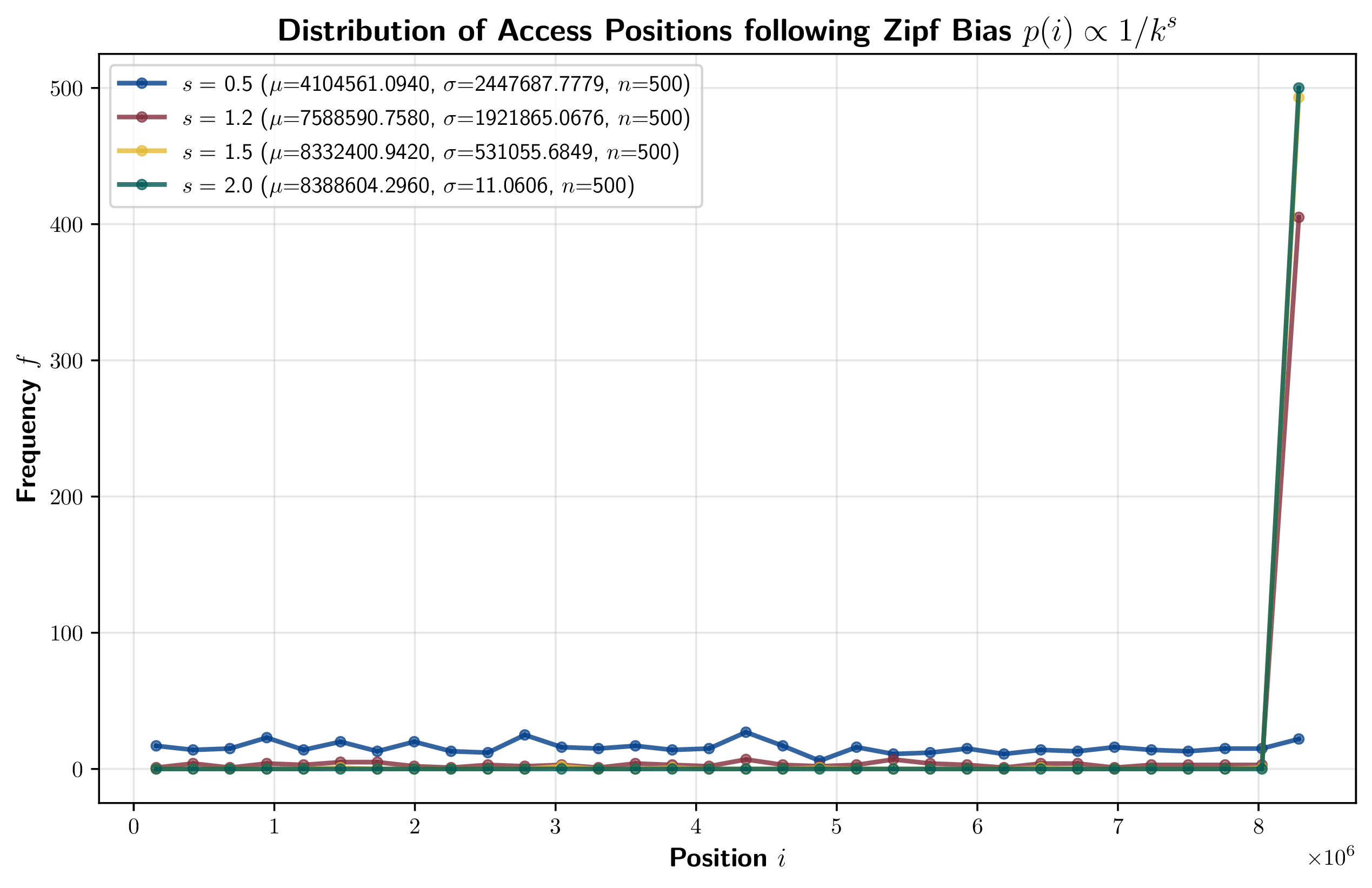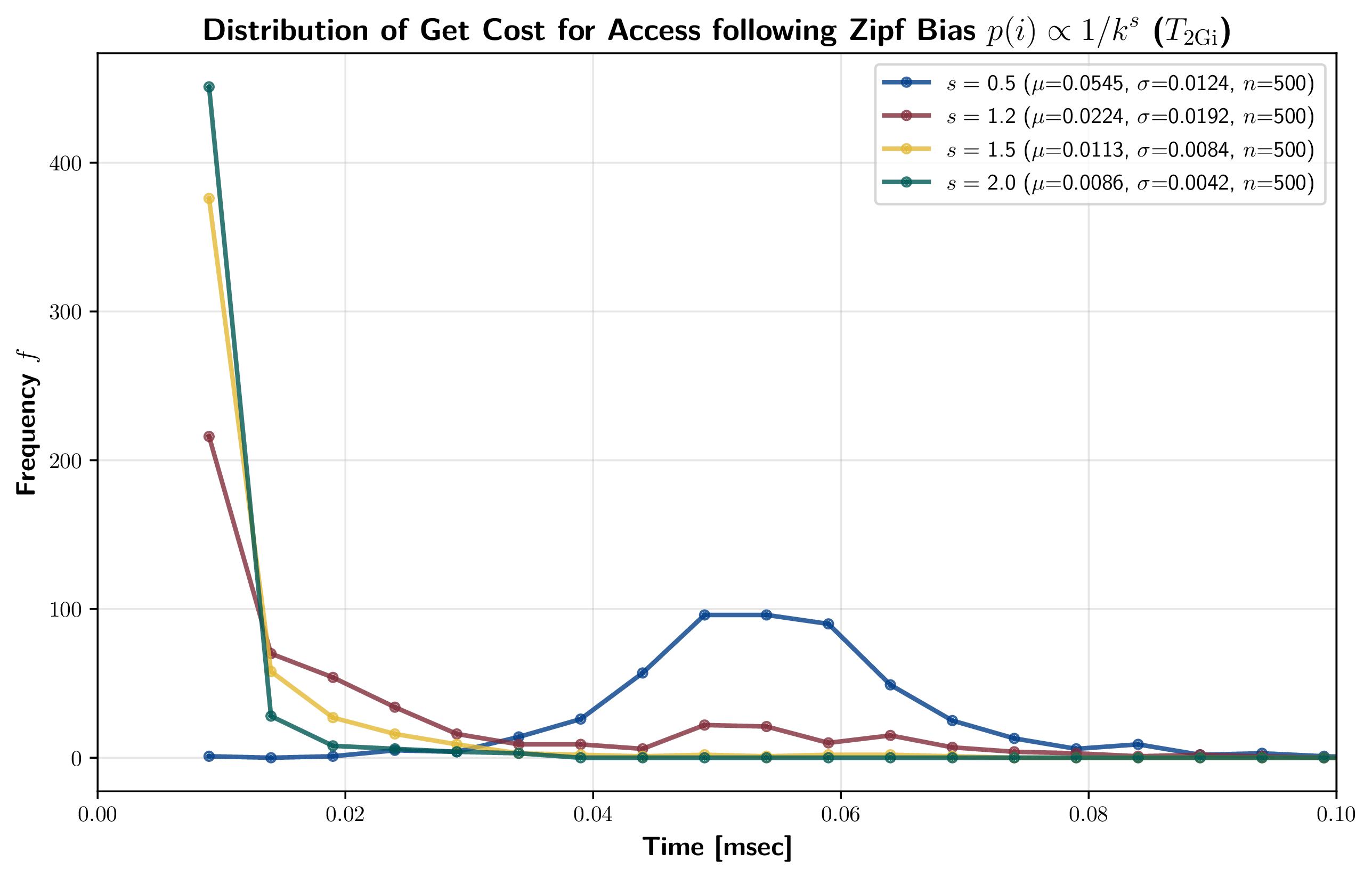 時間局所性を持つアクセスに対して Slate が有利に機能するという本文書の主張を示すために、アクセス頻度が最新データからの距離の Zipf 分布に従うワークロードでの get 性能を計測した。位置 \(i\) の最新データからの距離を \(r_i=n-i+1\) としたとき、その位置の重みを \(w_i = 1/r_i^s\) とする。ここで \(s \ge 0\) は分布の傾きを決定するパラメータである。このとき、位置 \(i\) のデータが参照される確率は \(p_i = \frac{w_i}{\sum_{x=1}^{n} w_x}\) とする。この分布に従う乱数をアクセス位置とし、\(n = 8{\rm Mi}\) 個のエントリが保存された Slate (file) 実装に対して 500 回の get を行い、その時間を計測した。この get 時間の分布を Figure 13 に示す。