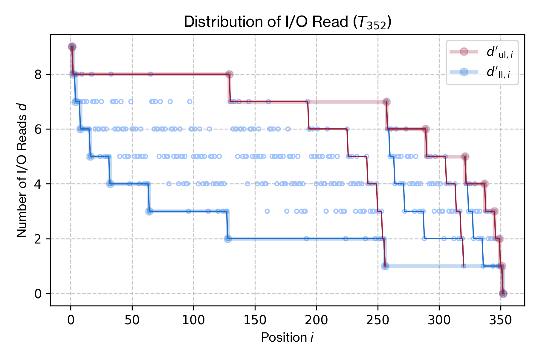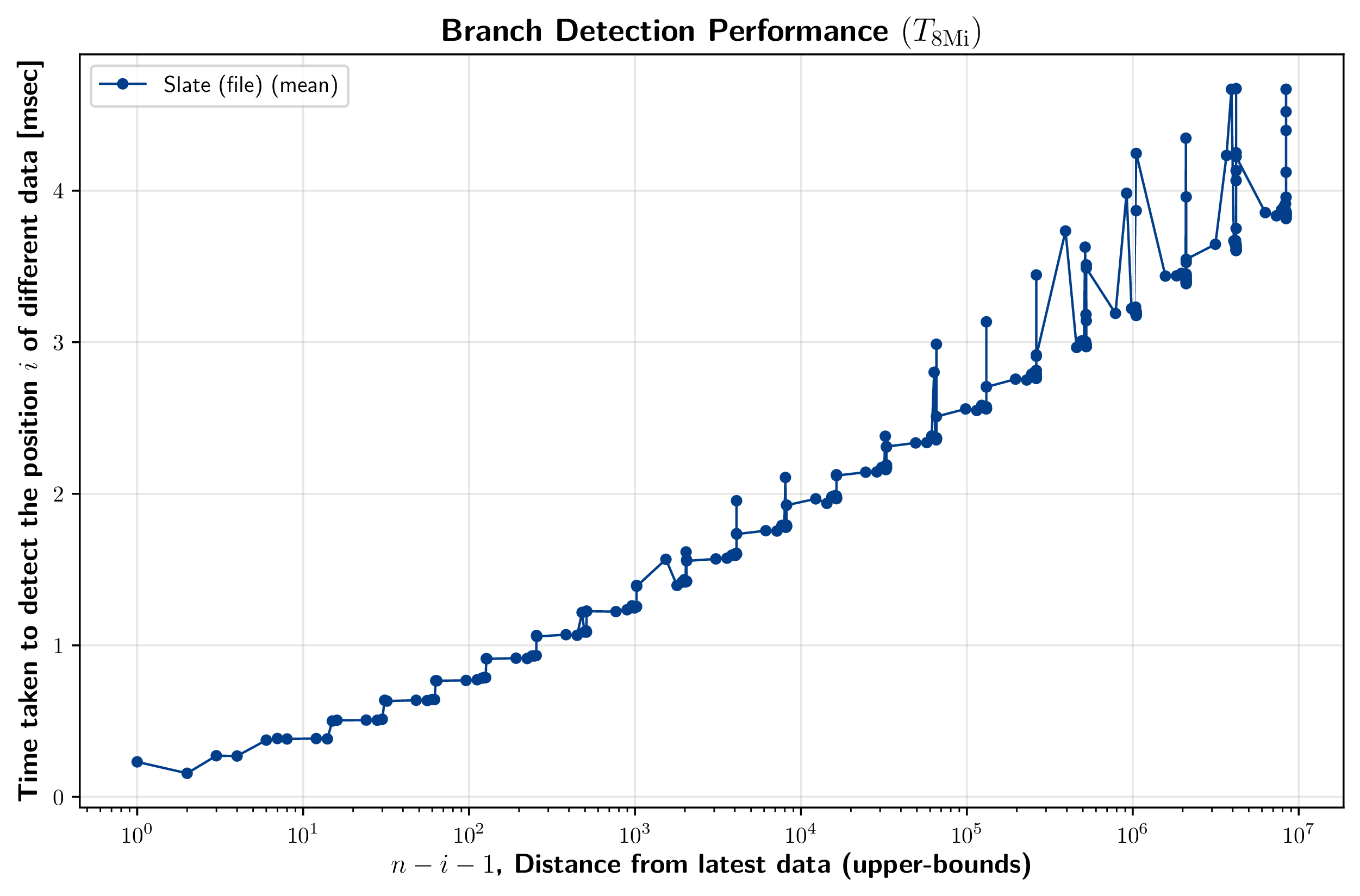 分岐の検出性能は、ある位置 \(i\) のデータのみが異なる Slate (file) を 2 つ用意し、認証パスを用いてその位置を特定するまでの時間を計測する。ここでそれぞれの Slate には \(n = 8{\rm Gi}\) 個のエントリが保存されており、差異の位置 \(i\) は I/O 回数の理論的上限となる、式 (\(\ref{io_read_worst}\)) の \(d'_u\) に基づく 277 個の位置を選択した。