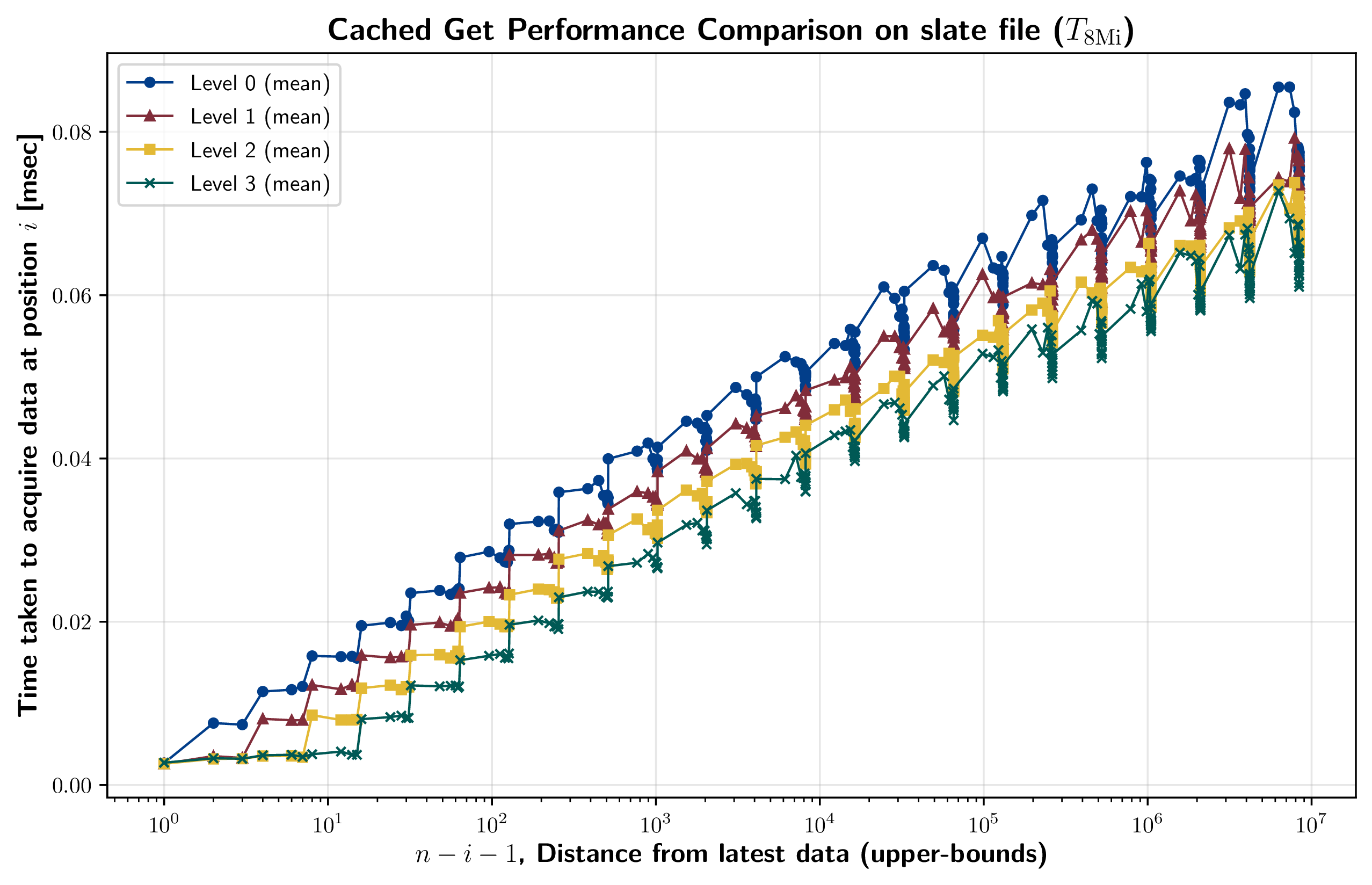 Slate (file) 実装において、キャッシュレベルを変化させた場合の get 性能を計測した結果を Figure 15 に示す。これは \(n = 8{\rm Mi}\) 個のエントリが保存されたデータストアに対して、位置 \(i\) のデータを参照するまでにかかった時間を表している。