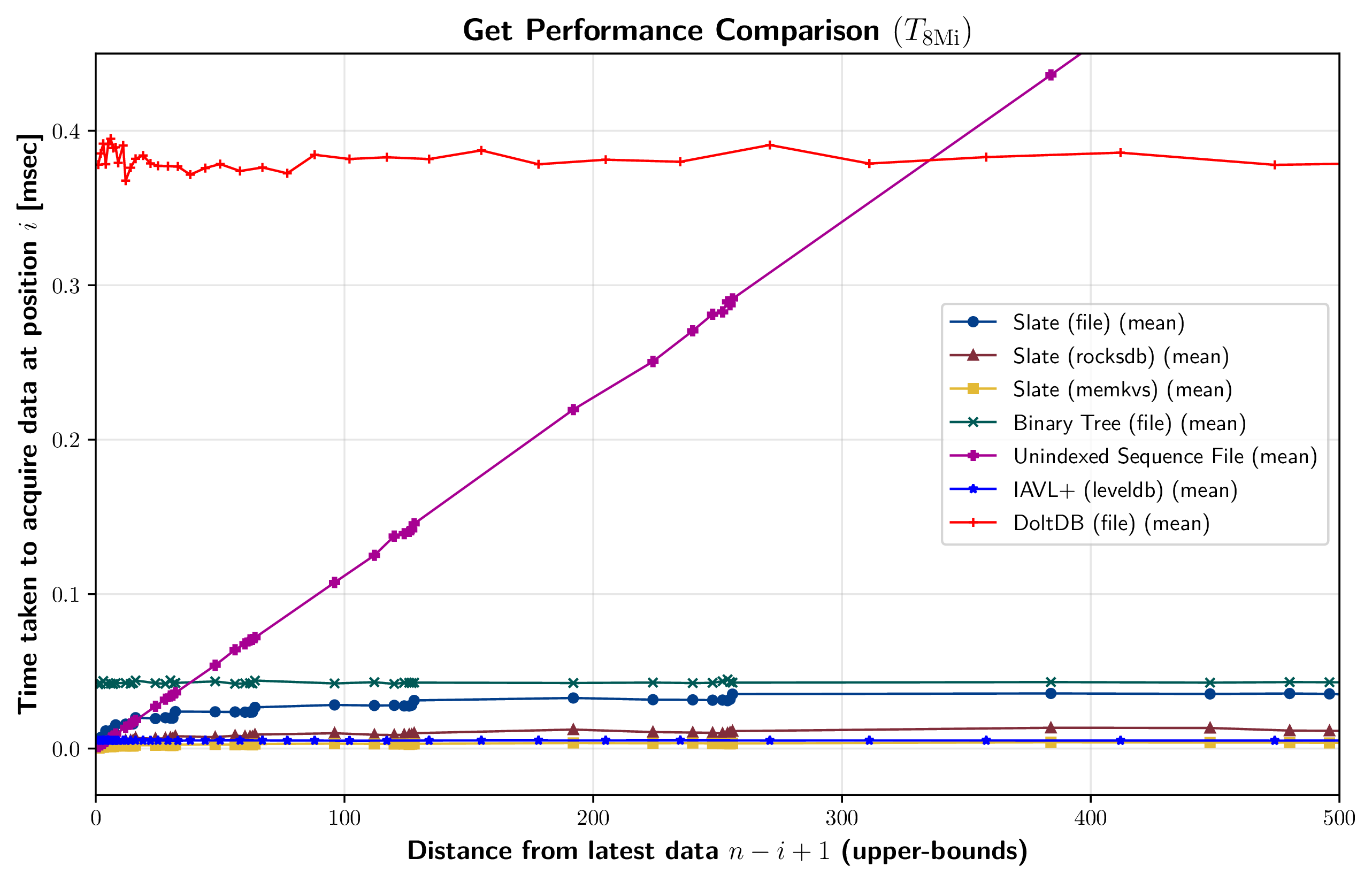 Slate (rocksdb) の計測結果は、最新データに近い位置で Slate (file) よりも良いが、遠い位置になると get 時間が対数の傾向を超えて大幅に増加する。これは、RocksDB の LSM-Tree 構造においてレベルが深くなると、単純なシーケンシャルファイルに比べて読み込みコストが大きくなるためと考えられる。