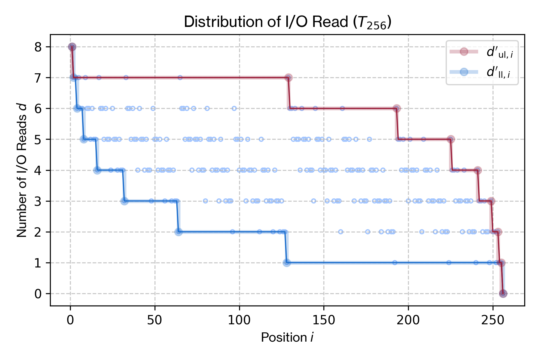 Binary Tree (file) の計測結果は、位置に依存しないほぼ一定の get コストを示している。これは、完全二分木構造がデータの位置に関係なく \(O(\log n)\) の I/O 回数でデータにアクセスする構造的特徴と一致している。