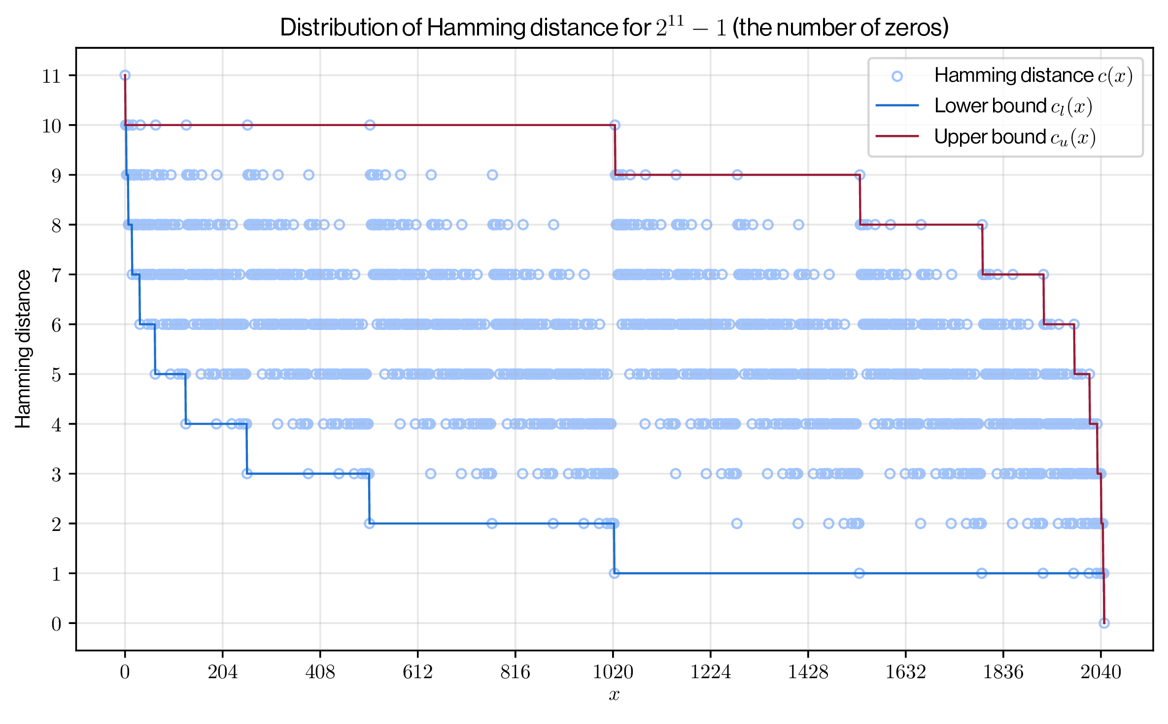 この計測結果を Figure 14 に示す。x 軸は最新データからの距離 \(n-i+1\) を対数スケールで示している。