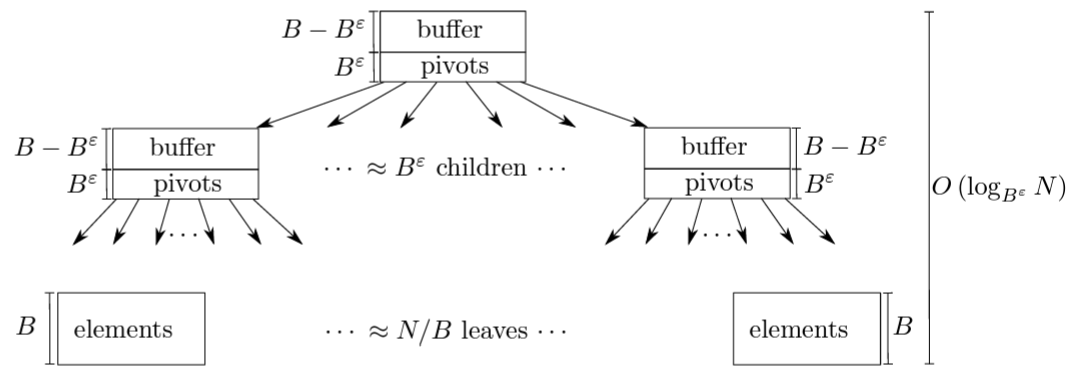 極端な例として、\(\epsilon=1\) の場合、Bε-Tree は内部ノードにピボットキーと子ポインタのみが含まれるため、単なる B-Tree となる。一方 \(\epsilon=0\) の場合、Bε-Tree は各ノードに大きなバッファを持つバイナリ探索木となり、バッファ付きリポジトリツリー [3] と呼ばれる。