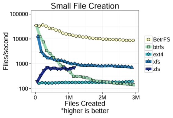 小さな書き込み. 我々は TokuDB ベンチマーク [10] を使って 4 つのスレッド (1 CPU につき 1 スレッド) を使用し、ファンアウトが 128 の平衡ディレクトリツリー (balanced directory tree) に 200 バイトのファイルを 300 万個作成した。BetrFS では、ファイルの作成は Bε-Tree への挿入として実装され、小さなファイルの書き込みはアップサートとして実装されるため、このベンチマークはこれら 2 つの操作における Bε-Tree のパフォーマンスを示している。Figure 2 は各ファイルシステムでのファイル作成時の持続レート (sustained rate) を示している (対数スケールに注意)。ZFS の場合、ベンチマークを完了する前にファイルシステムがクラッシュしたため、実験を 5 回再実行し最も実行時間の長い反復のデータを使用した。BetrFS は最初から最も高速なファイルシステムの 1 つであり、実験中も良好なパフォーマンスを維持した。BetrFS の定常状態の性能は他のファイルシステムよりも桁違いに高速である。