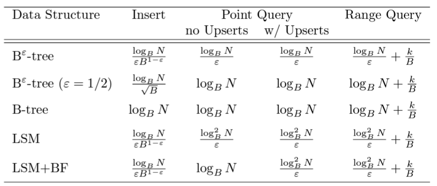Log-Structured Merge Tree (LSM-Tree) [7] は多くのバリエーションを持つ WODS である [8, 9]。通常、LSM-Tree 指数関数的に増加するサイズの B-Tree の対数で構成される。あるレベルのインデックスがいっぱいになると、次のインデックスにマージして空にする。各レベルが増加する係数は Bε-Tree の分岐計数 (\(B^\epsilon\)) に匹敵する調整可能なパラメータである。比較を容易にするために、Table 1 に増加計数 \(B^\epsilon\) を持つ LSM-Tree での操作の I/O 複雑度を示す。