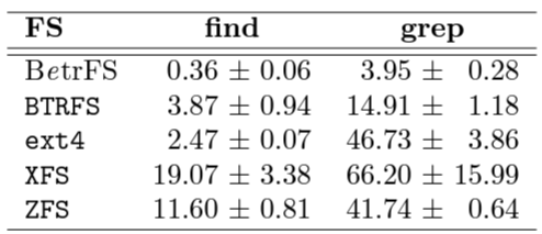 find と grep の両ベンチマークでは、ファイルシステムのデータとメタデータが大きなノードに保存され、フルパスによって辞書式にソートされているため良好な結果が得られる。したがって関連するファイルはディスク上で互いに近くに保存される。BetrFS もメタデータのみを含む第 2 のインデックスも保持するため、メタデータのスキャンを範囲クエリーとして実装することができる。その結果、BetrFS は他のファイルシステムよりもディレクトリのメタデータとファイルデータの検索を 1~2 桁高速に行うことができる。