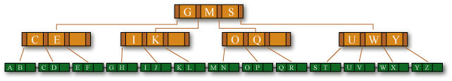 - 分割: 中間ノードの保持するサブツリー数が \(M+1\) を超えている場合、中間ノードを分離する。