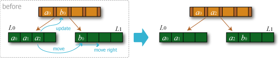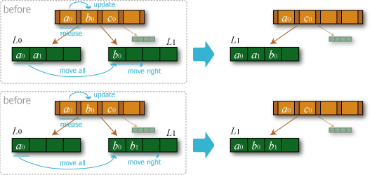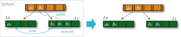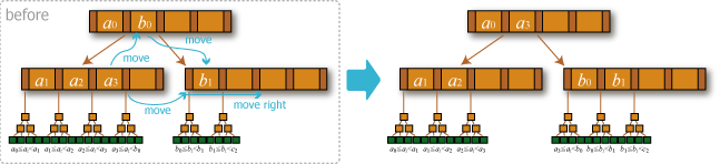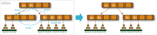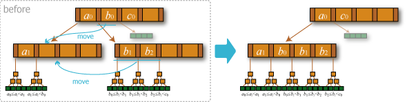 - 統合: 前後の葉が \(t\) 以下のエントリしか持っていない場合、そのどちらかと全エントリをマージし、親の中間ノードから空いた葉の境界値とポインタを削除するして開放する。なお、前後どちらの葉に統合しても同じ結果となるが、後方の葉への統合は先頭のエントリが変わることから手数が多くなる。このためノードのマージは前詰め手順で行うと良い。以下、マージされた葉の親の中間ノードに対する操作として説明を続ける。