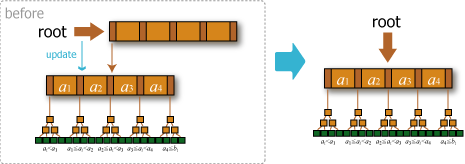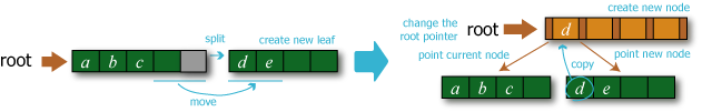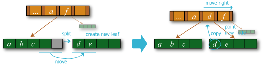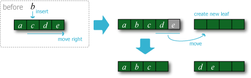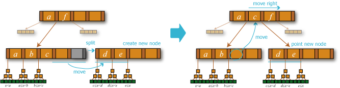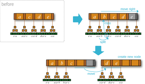 - 分割: エントリの挿入によって葉のエントリ数が \(M\) を超えた場合、新しい葉を作成し後半のエントリを移動する。