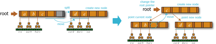 - 分割前の中間ノードがルートだった場合 (中間ノードが親を持たない場合)、新しい中間ノードを作成し 2 つに分離したサブツリーをポイントしてルートをその中間ノードに設定し挿入操作を終了する。