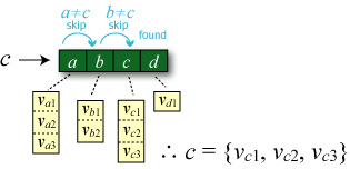 - 評価対象のノードが葉の場合、その葉が持つエントリからキーに該当するエントリを逐次検索し、その結果をもって検索操作を終了する。