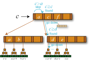 - 評価対象のノードが中間ノードの場合、サブノードの境界値がキー以上である位置のサブノードに対して再帰的に 2. 以降を繰り返す。