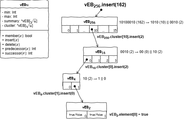Figure 1 は \(n=256\) (8 ビット) の van Emde Boas 木に値 162 を挿入する例である。まず、162 = 0b10100010 は上位 4 ビット 10 = 0b1010 と下位 4 ビット 2 = 0b0010 に分割され、第一階層 \({\rm vEB}_{256}\) のクラスタ 10 へ値 2 で進む。第2階層 \({\rm vEB}_{16}\) では値 2 = 0b0010 を上位 2 ビット 0 = 0b00 と下位 2 ビット 2 = 0b10 に分割し、クラスタ 0 へ値 2 で進む。この操作を葉まで繰り返し、最終的に存在を表す true を設定する。