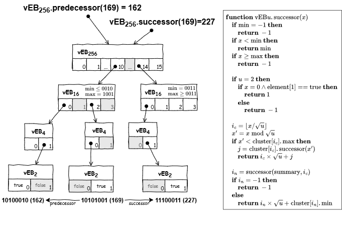 各ノードが、そのノードの配下に含まれる値の最小値と最大値を記録しているため、ある値の一つ前の値 (predecessor) と一つ後の値 (successor) も効率よく検索することができる。