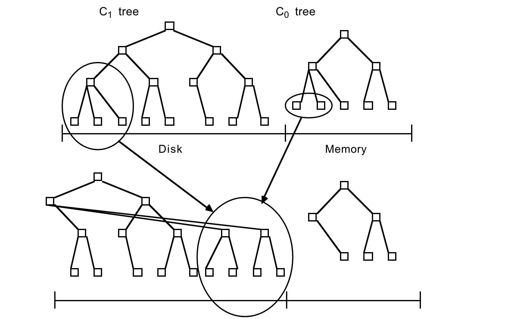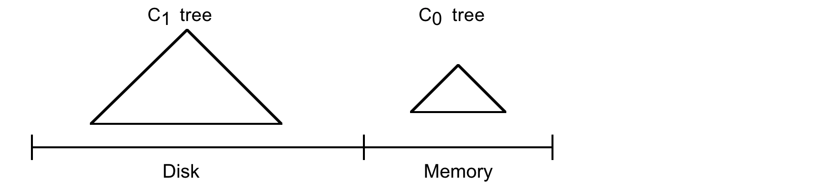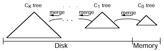 2-コンポーネント LSM-Tree には C0 ツリー (または C0 コンポーネント) と呼ばれる完全にメモリ常駐の小さなコンポーネントと、C1 ツリー (または C1 コンポーネント) と呼ばれるディスク常駐の大きなコンポーネントがある。C1 コンポーネントはディスク常駐だが、C1 内の頻繁に参照されるページノードは通常通りメモリバッファに残る (バッファは図示されていない) ため、C1 の人気上位ディレクトリノードはメモリ常駐であることが期待できる。