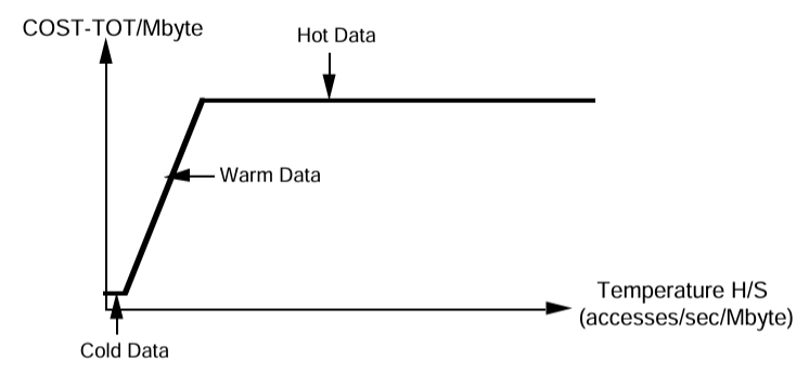 与えられたデータ S に対してページアクセスレート H が増加すると COST-TOT のグラフには 3 つのコスト状態が現われる。Figure 1.1 では COST-TOT/MByte と H/S (1 秒当たりのアクセス数/メガバイト) をグラフにしている。S が小さい場合、COST-TOT はディスクメディアのコスト S・COSTd によって制限され、これは S が固定されている場合は一定である。H/S が増加するにつれてコストはディスクアームの使用量 H・COSTP が支配的に形、S が固定されている場合は H/S の増加に比例する。最後に、5 分ルールによってメモリ常駐が決定される時点で S・COSTm + S・COSTd が支配的な要因になり、これは現在のコストのメモリ項 COSTm >> COSTd によって支配される。Copeland ら [6] に従いデータ本体の温度 (temperature) を H/S と定義し、これらの 3 つのコスト状態をコールド、ウォーム、ホットと名付ける。ホットデータはアクセスレート H が十分に高く、したがって H/S も高いためメモリバッファの常駐が正当化される ([6] 参照)。もう一方の極端な例では、コールドデータはディスク容量が制限される。つまり、コールドデータが占有するディスクボリュームには I/O レートを満たすのに十分なディスクアームが付属する。その中間にあるのがウォームデータで、そのアクセス要件は各ディスクアームで使用されるデータ容量を制限することによって満たされる必要があり、ディスクアームが使用限界となる。これらなお範囲は次のように分割される: