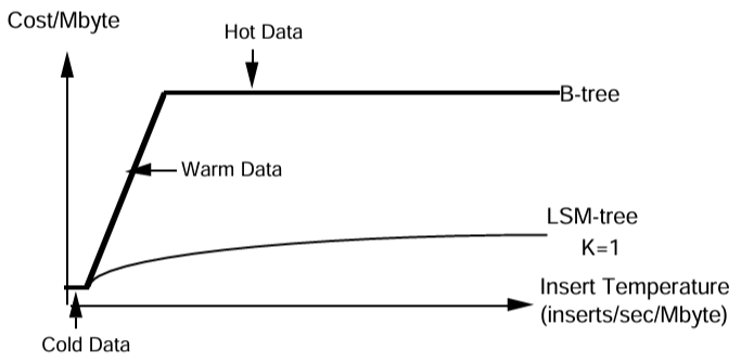 B-Tree におけるバッファリングの効果はアクセスレートがホットデータ領域に入るとグラフが平坦になることであり、よりアクセス頻度が高くなってもコストがこれまで以上に高くなることはなく、ウォームデータの上昇ラインの傾きが拡大する。少し考えれば LSM-Tree の効果は、挿入や削除のようなマージ可能な操作の現実的なアクセスレートでは、アクセスコストをコールドデータのコストに大幅に近づけることがわかる。さらに Figure 4.1 において「ホットデータ」とラベル付けされているような、B-Tree のメモリ常駐を示すアクセスレートの多くのケースは、LSM-Tree ではほとんどディスク上に収容することができる。このような場合、データは論理アクセスレート (挿入/秒) の点ではホットだが、LSM-Tree のバッチ効果により物理的なディスクアクセスレートではウォームに過ぎない。これはマージ可能な操作が非常に多いアプリケーションによって非常に大きな利点である。