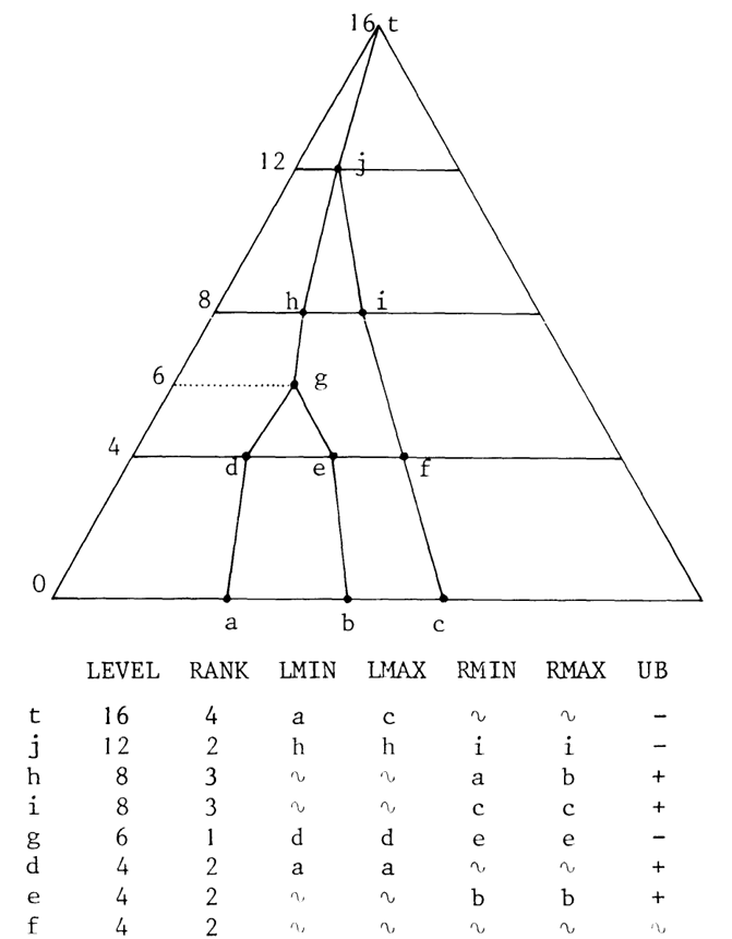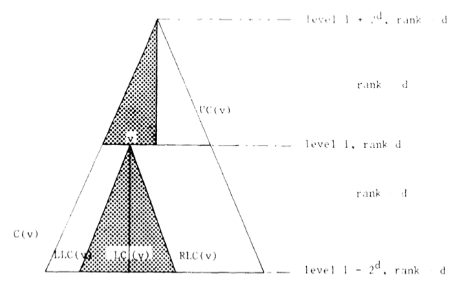 insert,delete,neighbourはすべてその内部呼び出しがボトム呼び出しであるという性質を持つ。この場合、完全な木も下位木であるとみなす。この観察は KAAS & ZIJLSTRA [8] によるものである。ランク \(d\) のノードでは、ランク \(d\) の親ポインタは手続きによって検査されることはない。これは、それらの値が内包する再帰呼び出しのローカル変数のスタックに保持されているという事実に起因する。特に、\(d\) 次の呼び出しでは対象とする CS 内に (