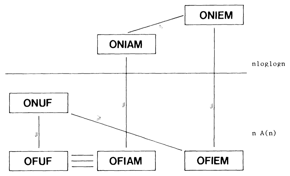 上記のアルゴリズムがいかに効率的であるかは最近になってようやく確立された。その平均処理時間は当初 \(O(\log \log n)\) (FISHER [6]) や \(O(\log^* n)\) (HOPCROFT & ULLMAN [7] および独立に PATERSON (未発表)) と推定されていたが、最終的な上限と下限 \(O(A(n)\) が TARJAN [9] によって証明された。\(\log^* n\) は関数 \(2^{2^{⋰^{2}}}\) の逆関数、つまり \(\log^* n\) は \(n\) をゼロまで減らすのに必要な 2 を底とする対数の適用回数に等しいことに留意されたい。関数 \(A(n)\) は \(a(0,x)=2x\); \(a(i,0)=0\); \(i \ge 0\) に対して \(a(i,1)=2\); \(a(i+1,x+1)=a(i,a(i+1,x))\) のように定義されるアッカーマン型の関数の逆関数である。そして \(A(n)=\min\{j \,|\, a(j,j) \gt n\}\) である。(この定義は TARJAN の定義と本質的に異なる)。