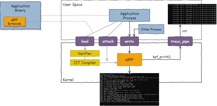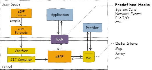 BPF バイトコードの実体は C 言語から LLVM などのバックエンドを介してコンパイルされた命令セットである (したがってユーザ空間でも動作することができる)。カーネルにロードされた BPF バイトコードはシステムを再起動することなくアトミックに更新され、Verifier によって実行安全性の検証を受けてから JIT コンパイラでネイティブコードに変換される。