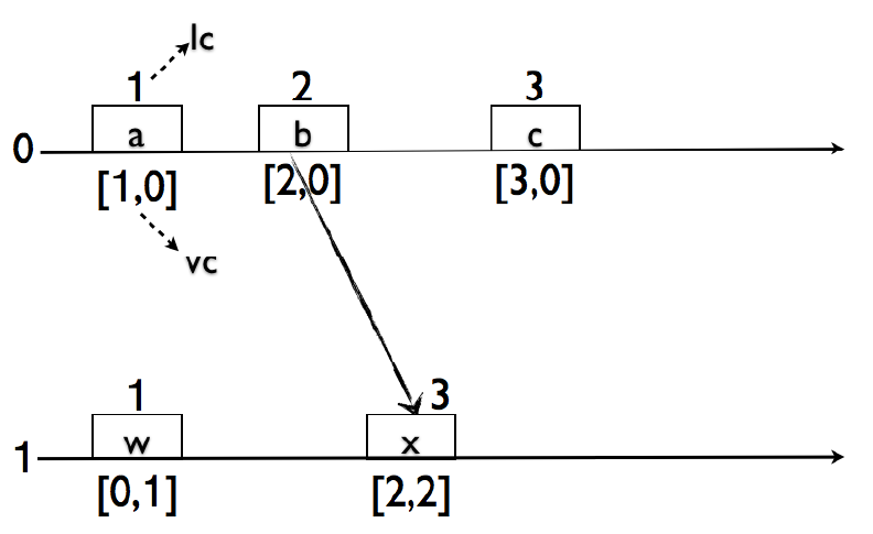 1988 年にはベクトルクロック (VC) [7, 19] が LC のベクトル化バージョンとして提案された。VC では各ノードでベクトルを保持し、そのノードが他のノードの論理クロックについて持っている知識を追跡する。LC は一貫性のあるスナップショットを 1 つの (関与するすべてのノードで同じ LC 値を持つもの) を見つけるのに対して、VC は可能なすべての一貫性のあるスナップショットを特定できる。これはアプリケーションのデバッグで有用である。Figure 1 に示すように、LC では (a, w) が一貫性カット (consistent cut) として検出されるが、VC は (b, w) や (c, w) も一貫性カットとして識別する。しかし残念ながら、VC の空間要件はシステム内のノード数に比例するため、実用的には許容できないレベルとなる。