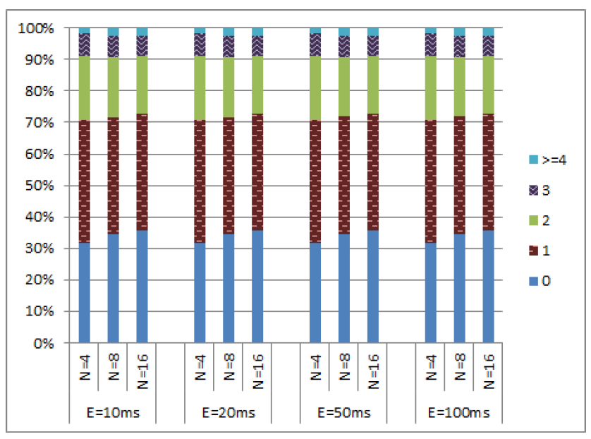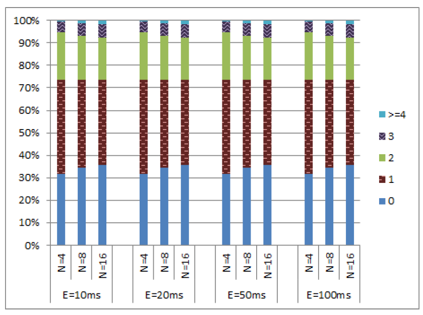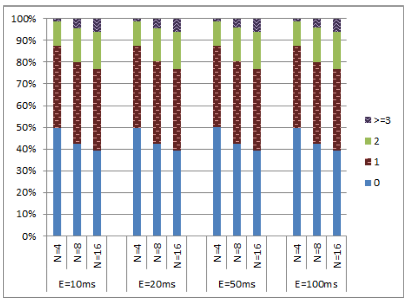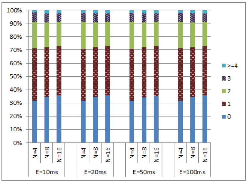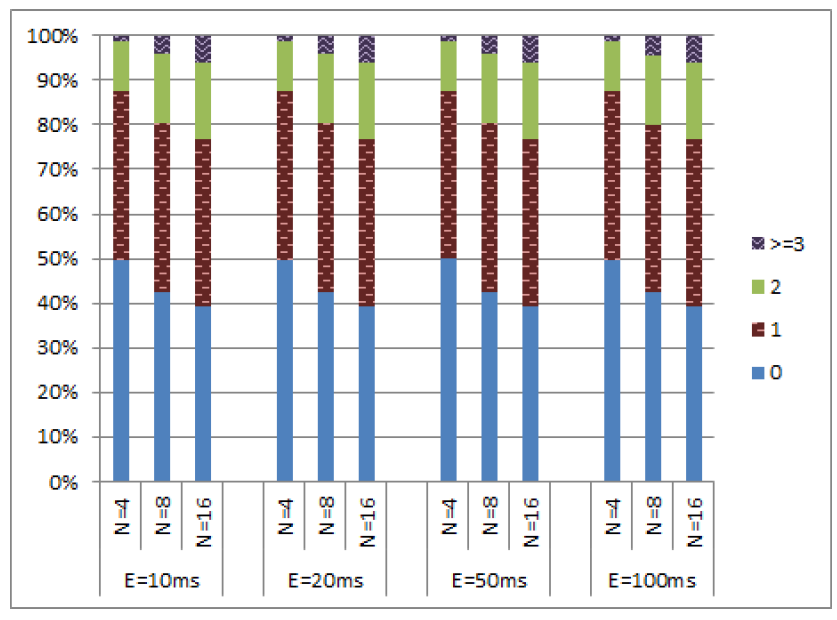 これらのシミュレーションでは、クロックドリフトが \(\epsilon\) を超えない限りノードの物理クロックを 1ms 進めることができる。ノードが物理クロックを進めることを許可されている場合、それを増加させるのは 50% の確率である。クロックを進めるときに一定の確率でメッセージ送信できる (このセクションのすべてのシミュレーションでは、この送信確率を 100% と仮定している)。我々はこのメッセージは最も早い実現可能なタイミングで送信し、実質的に送信時間を 0 とする。その結果は Figure 7 に示す通りである。これらの図が示すように、\(c\) 値の分布は \(\epsilon\) の値に対して比較的独立していた。さらに、99% 以上のイベントで \(c\) 値は 4 以下であり、\(c\) 値が 5 から 8 の範囲となるイベントは 1% 未満であった。