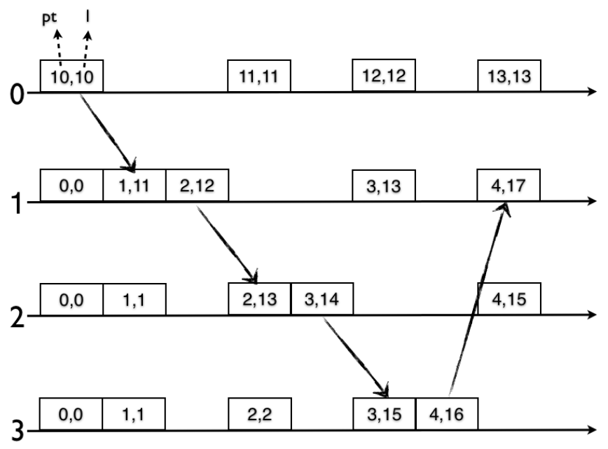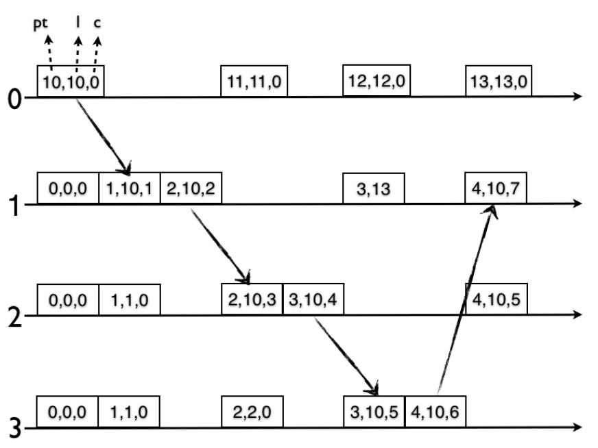 Figure 3 に示すアルゴリズムが問題定義で示された最初の 2 つの要件を満たしていることは容易に確認できる。しかしながら、このナイーブなアルゴリズムは 4 つ目の要件を満たしておらず、これが空間制約下での表現における 3 つ目の要件の違反にもつながる。この 4 つ目の要件違反を示すため、Figure 4 に示す反例を参照されたい。この図は \(|l.e-pt.e|\) が無制限に増大していく様子を示している。ノード 1, 2, 3 間のメッセージングループは無限に繰り返すことができ、ループの各反復ごとに論理クロックと物理クロックのずれ (\(l-pt\) の差) は増大し続ける。