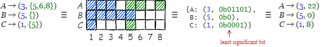 式 (\(\ref{bvv3}\)) 表記の値は (base, bitmap) ペアである。このように表記されたノード論理クロックをビットマップ化された (bitmapped) Version Vector と呼ぶ。