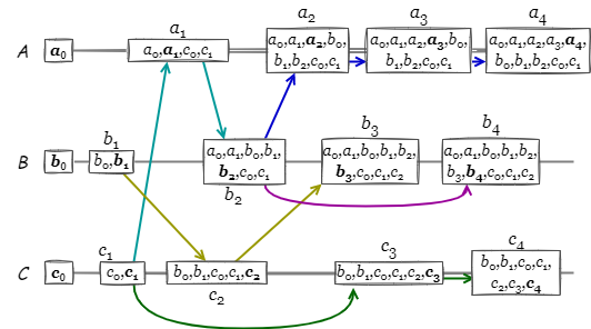 Fig 1 は \(A\), \(B\), \(C\) の 3 つのノードで構成される分散システムにおいて、それぞれのノードで因果一貫性に基づいて発生しているイベントの例を示している。例えば \(a_2\) は \(\{c_1,a_1,b_2\}\) のイベントに起因し、\(c_2\) や \(b_4\) とは並行するイベントである。