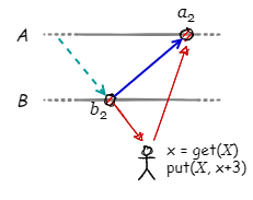 典型的な因果関係は read-modify-write パターン (get-put 操作) である。Fig 2 の例では最初にノード \(B\) の \(b_2\) を末尾とするコンテキストから値 \(x\) を get し、次にその値を +3 加算してノード \(A\) 上の新しいイベント \(a_2\) として put している。この一連の操作によって \(a_2\) が \(b_2\) に起因することは明らかである。