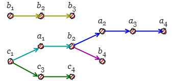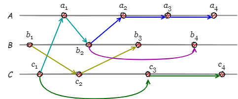 Causal History では同一のノード内で並行する因果関係を記述できないことに注意。言い換えると、同一ノード上のイベントはかならず因果関係を持つことを強制される。例えば \(c_2\) は \(b_1\) に起因しているが、\(c_1\) とも因果関係を持つことになっている。