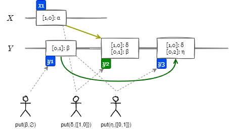 先述の競合の誤検出は Fig 10 でも c1-c3 や b2-b4 で起きている。Fig 12 は c1-c3 部分を DVV で置き換えたものである (見やすさのため若干変更している)。例えば y2 ではドット \(\{X:1,Y:0\}=[1,0]\) に値 \(\delta\) を関連付けて保存している。また y3 ではコンテキスト \([0,1]\) に対する更新操作であることが明らかであるため \(\beta\) を \(\eta\) に置き換えている。