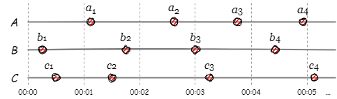 壁掛け時計 (wall-clock; ウォールクロック、物理時計) は参加者全員が見ることのできる共通の実時計を指す言葉である。具体的にはすべてのノードで完全に同期されている理想上のローカル時刻であったり、または時刻認証サーバのような役割を指している。Fig 4 は Fig 1 の例を壁掛け時計に基づくように書き直したものである。修復に LWW を適用するのであれば、ノード \(A\), \(B\), \(C\) は最終的にそれぞれ \(a_4\), \(b_4\), \(c_4\) のみを保存していればよく、システム全体は同期が進行するに連れてもっとも最後に発生したイベント \(c_4\) の状態に収束するだろう。