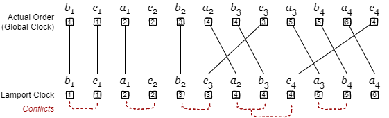 Lamport タイムスタンプは現実のタイムスタンプではないため時刻同期の問題は発生しないが、論理クロックの単調増加が保証できるのは単一のノード内に限定されているため、システム全体では半順序でありイベントの論理クロック値が重複(並行)する。[7] ではこれを全順序化する手段として、ノード ID とカウンターを組み合わせた値 (つまりドット) を論理クロックとし、カウンター値が同一の場合はノード ID の大小を考慮する方法が紹介されている。