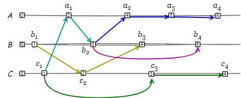 Fig 5 は Fig 1 の例を Lamport タイムスタンプを使って書き直したものである。例えば \(a_2\) は論理クロック値が 2 のノード \(A\) 上で発生しているが、論理クロック値 3 の \(e_{b_2}\) に起因していることから、\(a_2\) の発生によってノード \(A\) の論理クロックは 4 に更新される。
