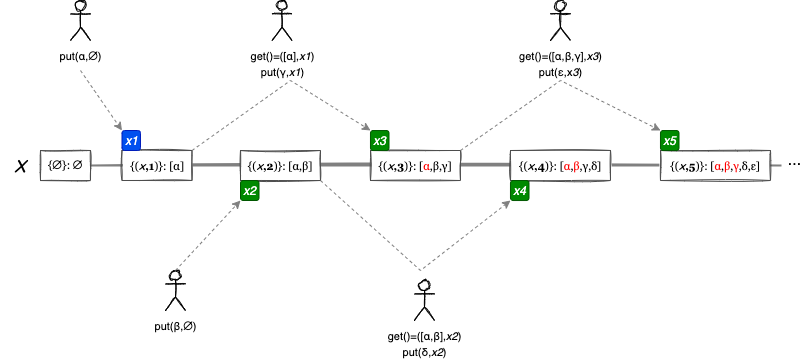 Fig 3 において因果関係が複数に分岐するとき、並行する異なるコンテキストが発生したこと、つまり競合が発生したことを意味している (概念上は git のブランチ機能を想像しても良い)。ここで 2 つの問題がある。