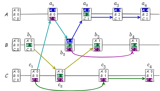 Fig 8 のイベント \(b_2\) の論理クロックは Causal Histories 観点で \(\{a_1,\) \(b_1,\) \({\bf b}_2,\) \(c_1\}\) と表記できる。Vector Clock の観点ではノード ID とのマップ \(\{A \mapsto 1,\) \(B \mapsto 2,\) \(C \mapsto 1\}\), {A:1, B:2, C:1} または簡略に \([1,2,1]\) と表記する。