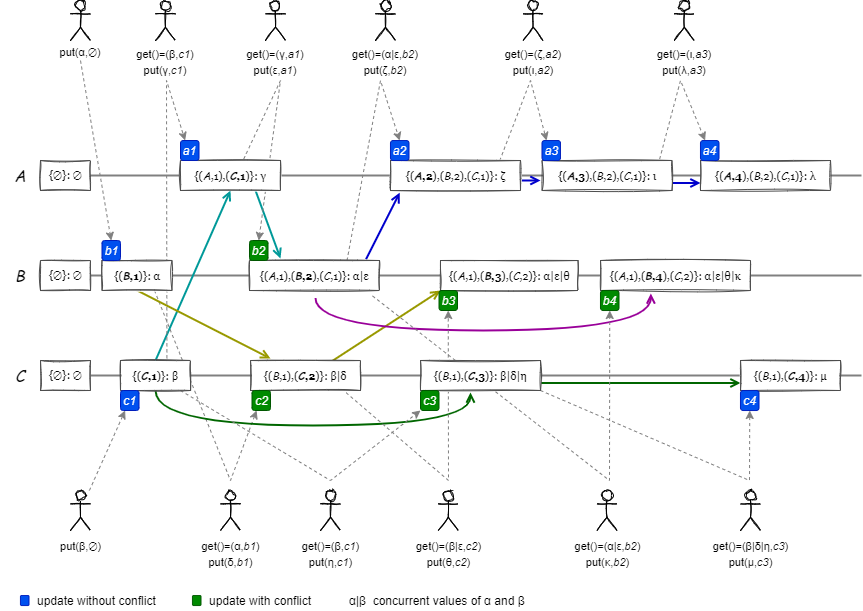 すべてのノードは空の Version Vector と空の値で開始する。クライアントは特定のコンテキストに基づいて値を更新する (指定するコンテキストがない場合は \(\emptyset\) を指定する)。ノードのコンテキストが更新操作のコンテキストより前であれば、その操作は競合していないため値は単純に置き換えられる (例:a2)。ノードのコンテキストが更新操作のコンテキストより後であったり (例:c3)、並行している場合 (例:b3) は並行値となる。