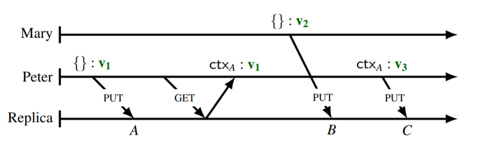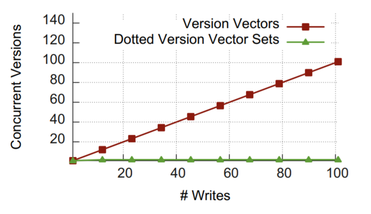 Fig 1 の例では、状態 \(B\) において \({\rm v_1}\) と \({\rm v_2}\) が同じように空のコンテキストで書き込まれたにも関わらず、両方とも固有のドットで表現されていることが分かる。Peter による最後の書き込みでは、\({\rm v_1}\) のドット (および dvv) よりもコンテキストが優先されるため \({\rm v_1}\) が正しく上書きされ、コンテキストよりも新しいドットを持つ \({\rm v_2}\) が維持される。これに対して vvserver はすべての兄弟を一つの vv にまとめているため、ドットを分離することで得られるこの区別を失ってしまい、\({\rm v_1}\) が \({\rm v_3}\) によって古くなっていることを知ることができない。