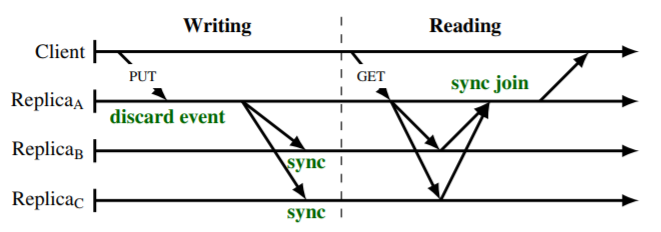 関数 sync と join を使って get 操作を定義する: サーバは get リクエストを受け取ると、レプリカノードの部分集合にそのキーのバージョンとクロックの集合を問い合わせ、sync をペアごとに適用して "マージ" することができる。ただしサーバは正常な応答に必要ないと判断した場合はこのフェーズを省略することができる。必要な情報が揃うと、因果関係の情報から取り除かれた値と、クロックに join を適用した結果のコンテキストがクライアントに返さえる。sync はレプリカノード間のアンチエントロピー同期などのタイミングでも使用できる。